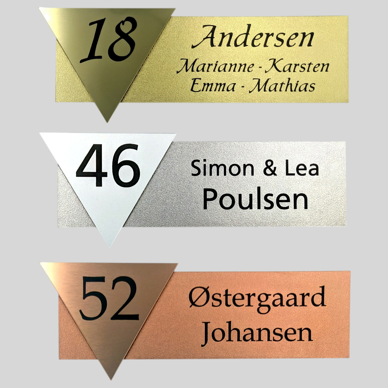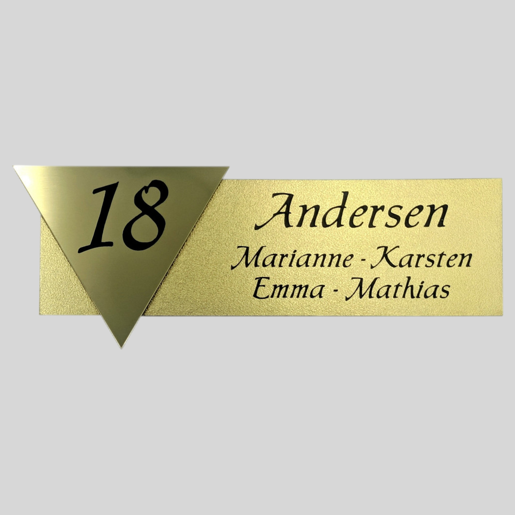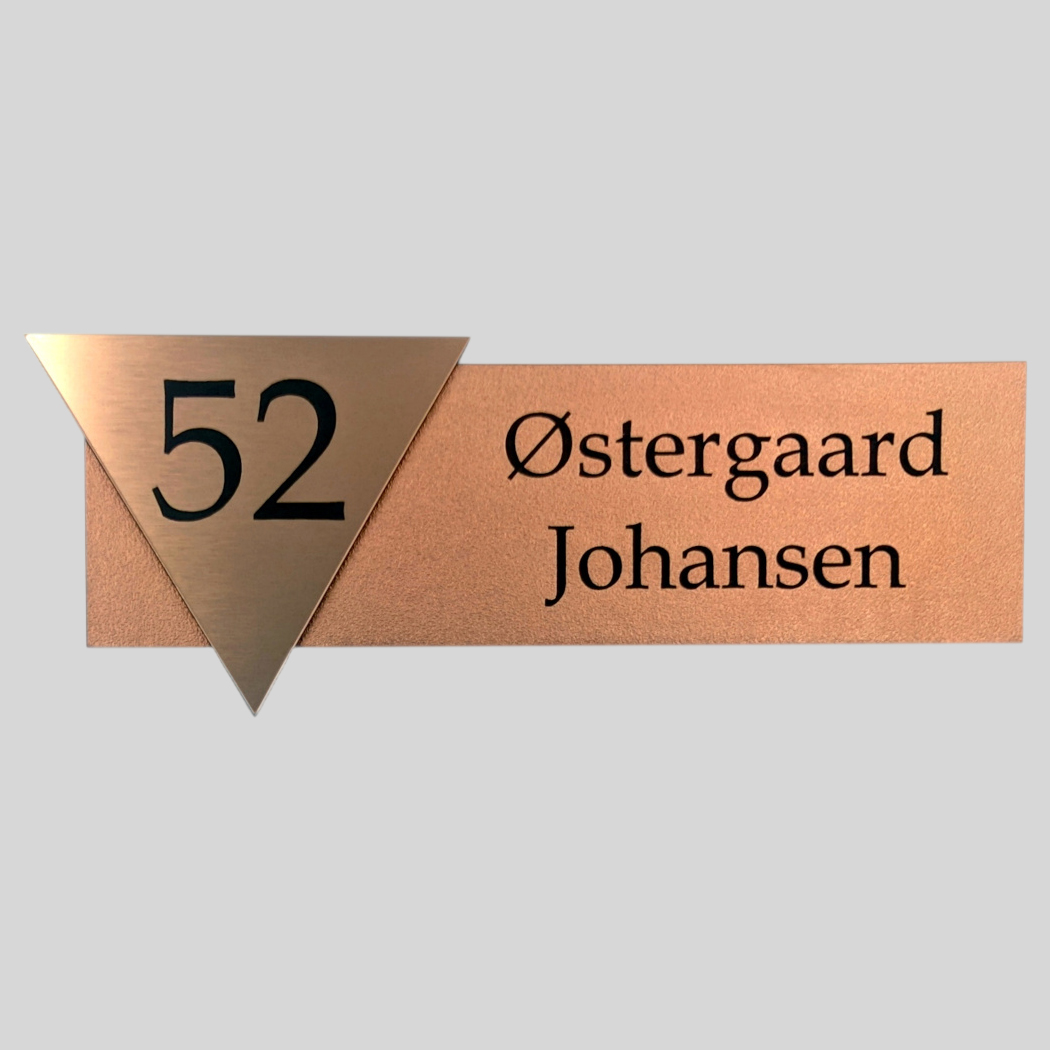 Skiltet er fremstillet i akryl med en flot sandblæst metaloverflade og fås i tre klassiske varianter: sølv, messing og kobber. Den sorte tekst står skarpt og sikrer høj læsbarhed – også på afstand.