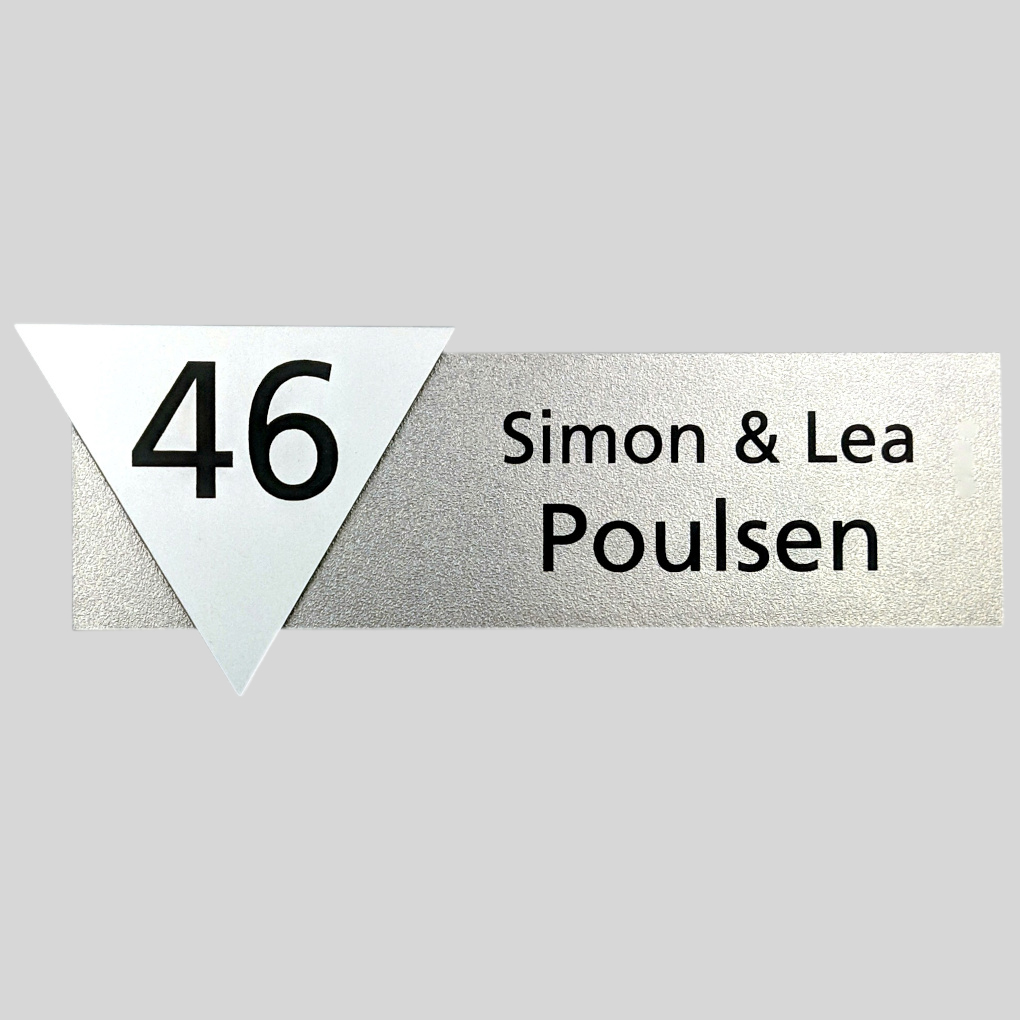 Husskilt i sandblæst metal look – med husnummer (sølv, messing & kobber)