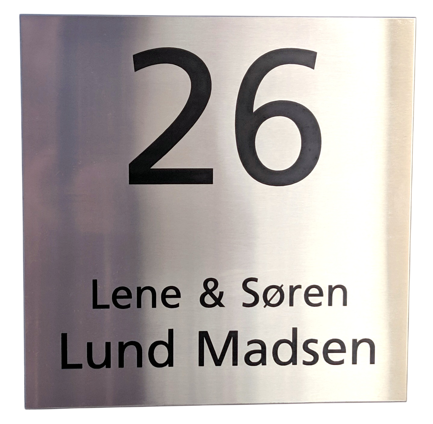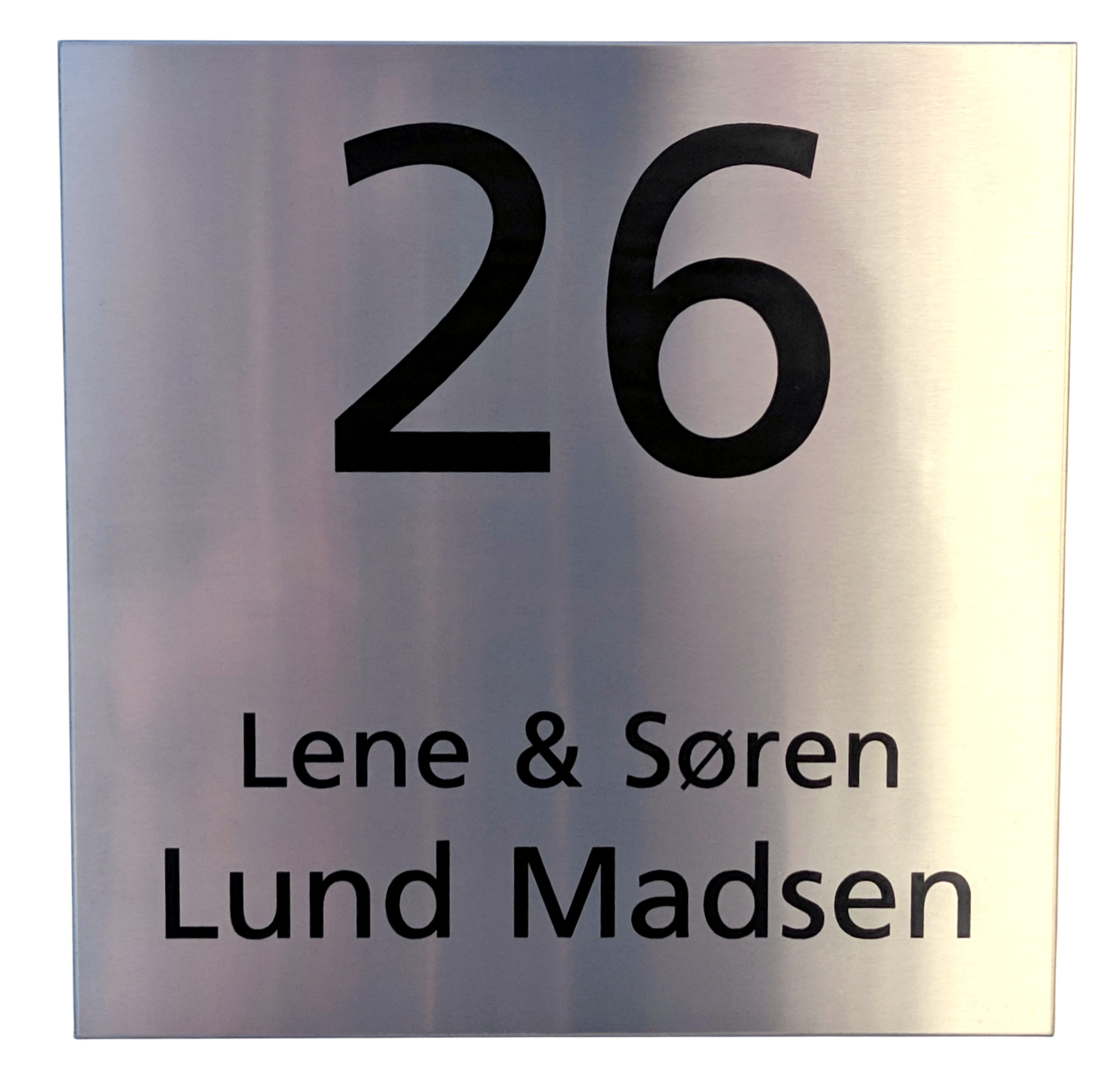 Navn og husnummer lasergraveres direkte i stålet og fremstår i sort for optimal synlighed.