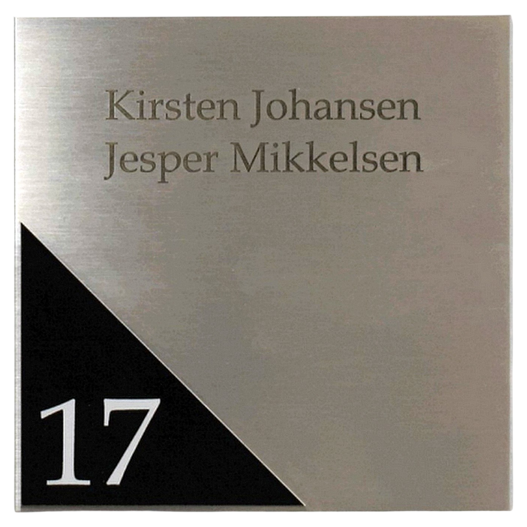 Dette rustfri stålskilt i 200 x 200 mm er et elegant valg til dig, der ønsker et moderne og eksklusivt udtryk ved din bolig eller virksomhed. Den børstede overflade giver et flot spil i lyset og passer perfekt til både nye og klassiske facader.