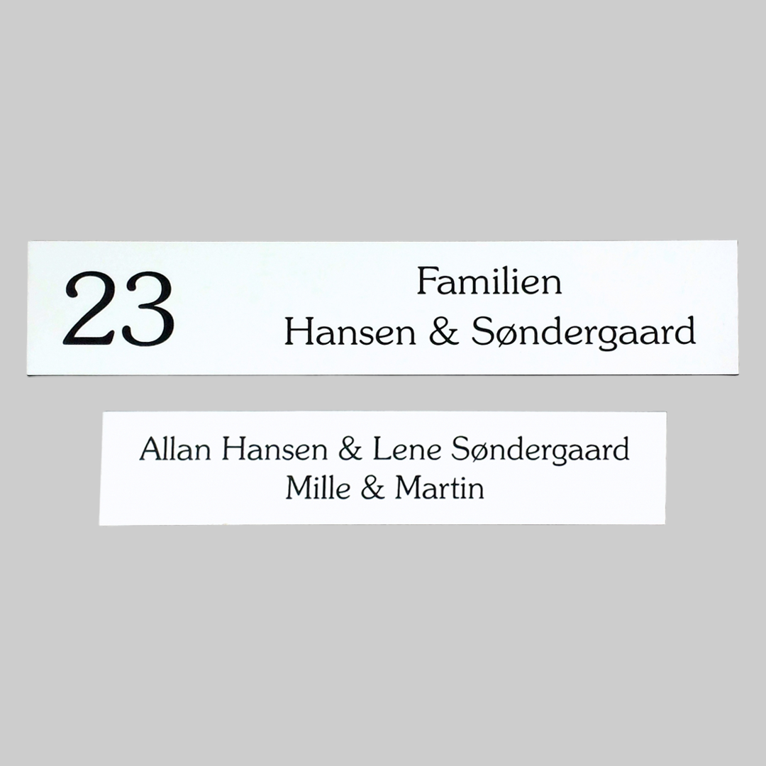 Giv din bolig et lyst og stilrent udtryk med et elegant hvidt skilt med sort tekst. Kombinationen af hvid baggrund og sort tekst giver en skarp kontrast, som sikrer høj læsbarhed og et klassisk design.